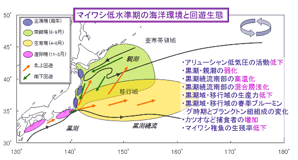 2)マイワシ太平洋系群の低水準期の生態構造 1988年以降の資源が低水準期にあるマイワシの海洋環境と回遊生態を示しています。1988年以降は、高水準期とは逆に、アリューシャン低気圧の活動が弱く、親潮の南下や黒潮の流れが弱まり、黒潮続流南部の水温が高温傾向になります。このような状況下では、親潮南下の弱まりや黒潮続流南部における混合層の浅化により稚魚の成育場である移行域のプランクトンの発生が少なくなり(プランクトン組成の変化により稚魚の発育段階に応じた適当な大きさのプランクトンが供給されないとも考えられます。)、成育に適した水域面積が大きく縮小します。また、黒潮続流南部の水温の上昇傾向によって稚魚期の捕食者であるカツオ・ビンナガ等暖海性大型回遊魚の北上を促し、これら外敵との遭遇機会も増加するとも考えられます。これらのことからマイワシ稚魚は稚魚期から幼魚期にかけて生き残りが極めて悪くなったと考えられます。さらに、1990年代にはカツオ・ビンナガ資源が増加している状況も影響があると考えられます。 このような生態構造は、資源の低水準期においても、年によって多かれ少なかれ変動が生じていると考えられます。