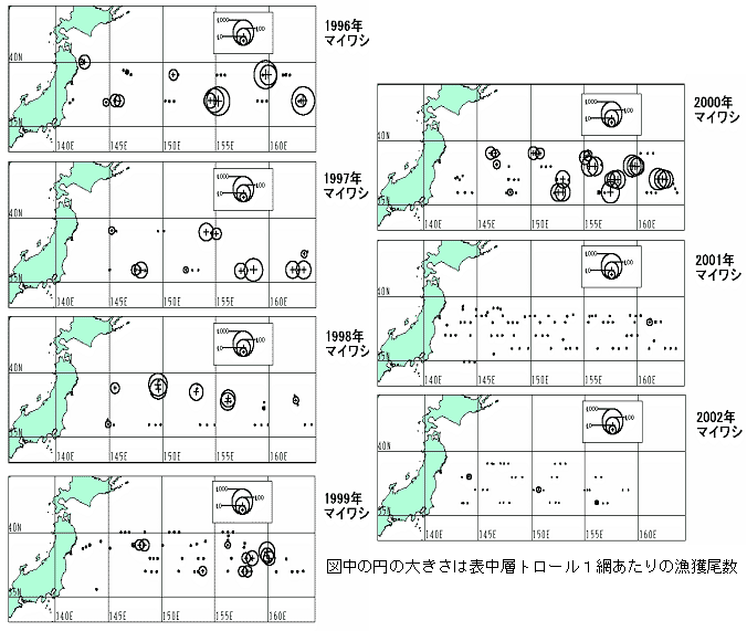 黒潮続流域におけるマイワシ稚魚の分布(1996〜2002年) (Watanabe and Nishida (2002))