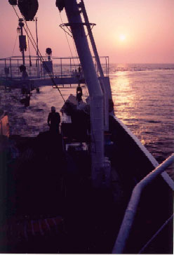 中層トロール操業前の調査船