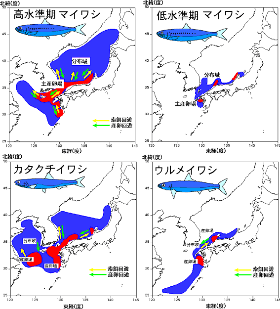 マイワシは資源の大きさによって分布域を大きく変えます。資源が多い時には東シナ海から日本海の広範囲に分布しますが、少ないときには日本の沿岸域に分布しています。カタクチイワシは、東シナ海・黄海に多いとされ、日本海の沖合域のやや暖かい海域に分布します。東シナ海・黄海と日本海のカタクチイワシの交流については知見がすくなく、不明な点が多くあります。ウルメイワシはマイワシやカタクチイワシと異なり、分布域はさほど大きくなく、東シナ海の大陸棚縁辺域に沿って日本海沿岸にまで分布しています。なお、全ての魚種は太平洋側にも分布し、マイワシとカタクチイワシは資源の増減とともに分布が拡大・縮小します。