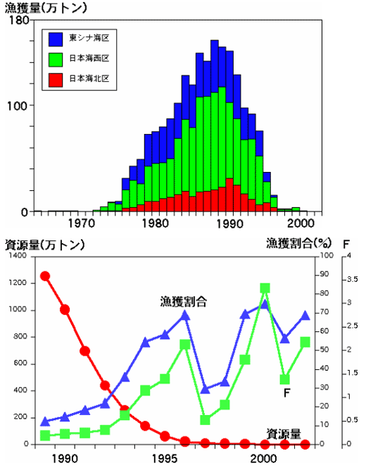 対馬暖流域(東シナ海・日本海)におけるマイワシは、日本・韓国・ロシアが漁獲していましたが、近年では日本のみが漁獲しています。日本の漁獲量の推移をみると、1990年代始めには160万トン近くの漁獲量でしたが、急激に減少し、2001年以降は1000トン程度にとどまっています。
