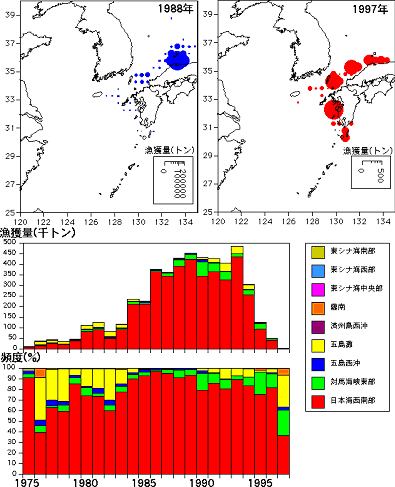 漁獲量がもっとも多かった1988年には島根県隠岐諸島周辺での漁獲量が多く、それから10年後の1997年には九州西岸から日本海の沿岸域で漁場が形成されました。