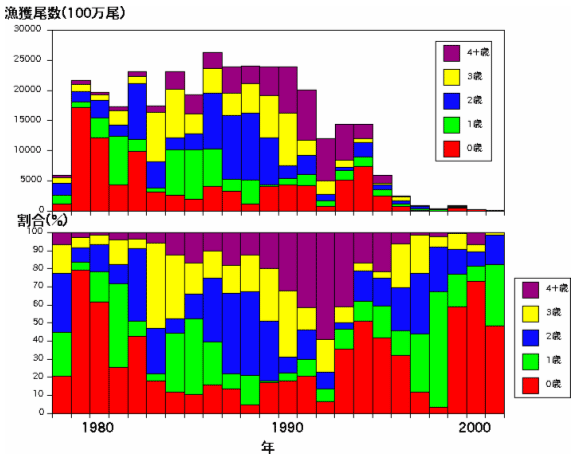 1970年代末から1980年代初めにかけて0歳魚の漁獲尾数が多くなり、80年代半ばには1〜3歳魚の漁獲が増加しました。そして1980年代後半から1990年代半ばまで4歳魚以上の割合が徐々に増加していたことが分かります。