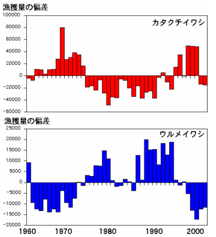 ウルメイワシの卵豊度などのデータはここ数年間のものしかなく、環境要因との因果関係は不明です。ウルメイワシはカタクチイワシと同様に仔魚期から成魚期に至るまで動物プランクトンを捕食しています。また、分布域もカタクチイワシと似ている上に、寿命などもほぼ同じ程度と考えられています。したがって、この両種はお互いに競合関係にあると判断し、両種の漁獲量の偏差を比較しました。